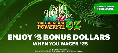 The journey continues! Wager $25 on The Wizard of Oz™ The Great and Powerful Oz and snag $5 Bonus Dollars to keep spinning.